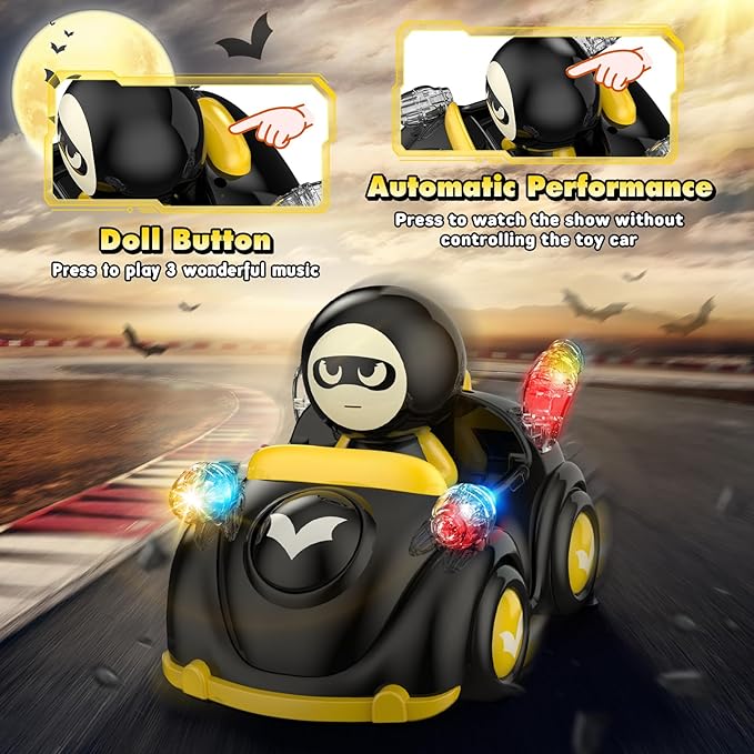 - 【Cute Bat Design with Lights & Music】Designed as a cartoon superhero and equipped with flashing lights and 3 cheerful music, our bat toy car wakes up the kids' curiosity, attracts their attention, and provides hours of joyful play