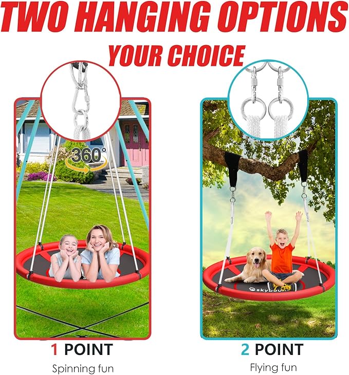- 【Easy Assembly & Versatile 43’’ Swing】Quick tool-free setup in minutes. This saucer swing supports dual or single-point suspension for 360° rotation, enhancing balance and sensory play on your tree swing for kids outdoor.
