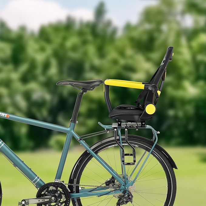 - 【ADJUSTABLE CHILD SEAT】The seat armrests on both sides can be moved, and the inner space of the rear mounted bicycle child seat can be adjusted according to the child's body shape,This rear child bike seat features a wide and comfortable backrest, soft sponge armrests, comfortable seat cushions, three-point buckle seat belts, and thick foot pedals; Ensure the safety and comfort of your kids