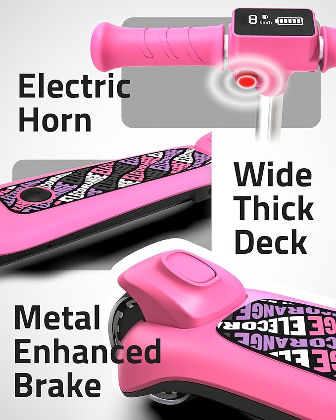 - PARENT'S PEACE OF MIND - 0 Assembly required, saving your time. The quick folding feature makes the power scooter ready in 2 seconds. Elecorange 3 wheels electric scooter for kids allows your child to instantly get on and ride. Start with foot sensor, easily lean to turn, even small kids don't need to have perfect balance or coordination to ride this scooter safely. You can trust your children's independence on the scooter. LCD display shows the lithium battery level, easily manage the battery.
