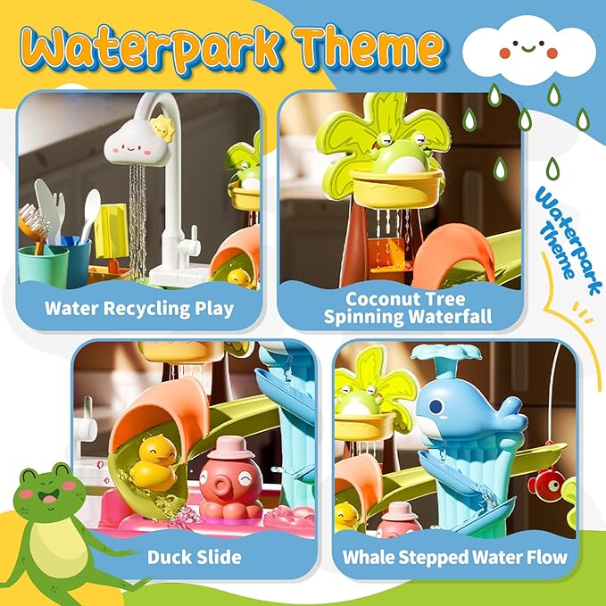 - Welcome to the Mini Water World! Watch the animals have a blast at the water park! The duck rides waves, the whale sends water down steps, and the frog enjoys a cozy bath, and the coconut tree waterfall adds a beautiful touch to the scenery. Don’t miss the thrilling fishing game, where kids can test their hand-eye coordination and compete to see who can catch the most fish. Nonstop water park fun awaits!