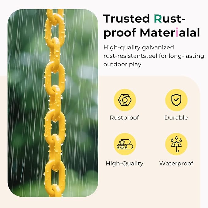 - Semi-dipped plastic chain is made of galvanized rust-proof steel with certain anti-corrosion and anti-rust properties,Prevent children from contacting the metal chain may produce injury. Allows children to play safely and fill the garden with laughter. The thermoplastic coating on the chain prevents pinching by filling in gaps, protects your child's fingers and small hands and provides a safe and comfortable grip.