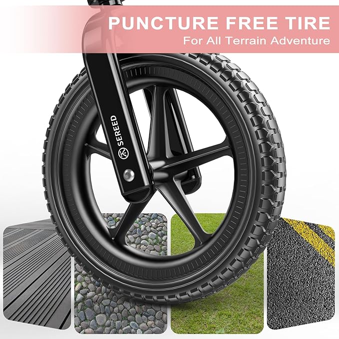 - STURDY AND SAFE- What you think for your kids is what SEREED toddler balance bike have. Wide and tough carbon steel frame, supports up to 110 lbs, safe footrest pad, rubber grips, soft saddle and a 12.6 inch starting seat height, let your little one enjoy cycling at an early age!