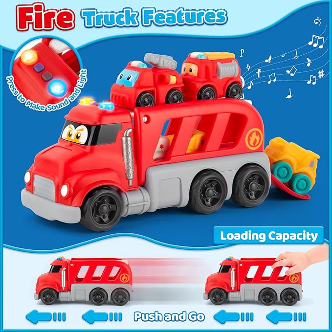 - Complete Toy Car Set: Our cars toy set has 8 soft rubber toy cars in different colors, including 2 large fire trucks and 6 small cars and 2 cute figures besides 1 big trailor, 1 traffic light, 1 traffic sign,。