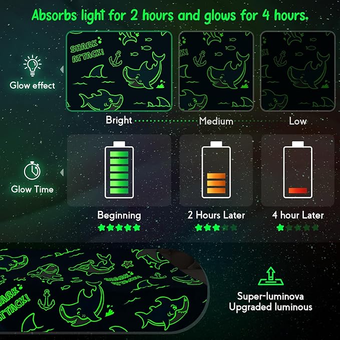 - How To Make It Glow: This shark blankets need to be exposed under sunlight or bright light for more than 15 minutes to have better luminous. The brighter the light is, the stronger the blanket will glow in the dark. This shark throw blanket is made of great quality luminous fiber woven material to absorb and store light energy, long-lasting glow in the dark, mysterious and interesting.
