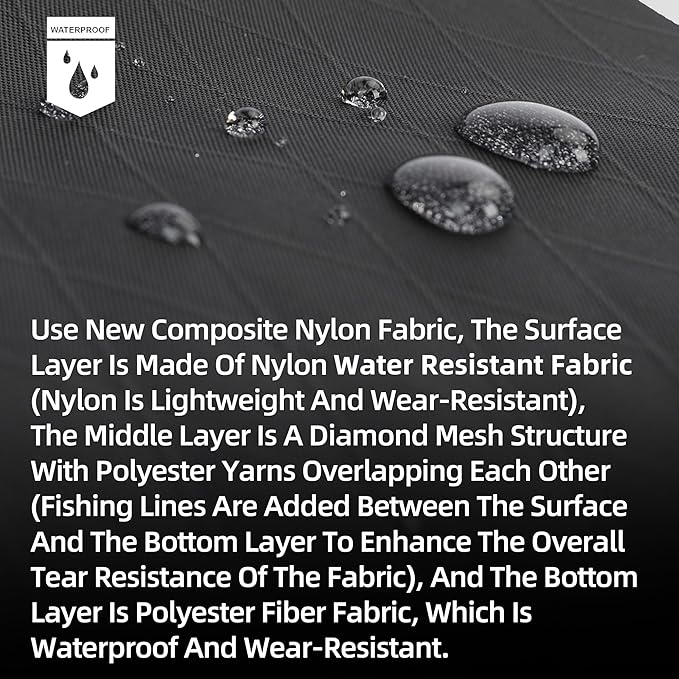 - The surface layer is made of nylon water resistant fabric, lightweight and wear-resistant. The middle layer is a diamond mesh structure with polyester yarns overlapping each other, to enhance the overall tear resistance of the fabric. And the bottom layer is polyester fiber fabric, which is water resistant and wear-resistant.