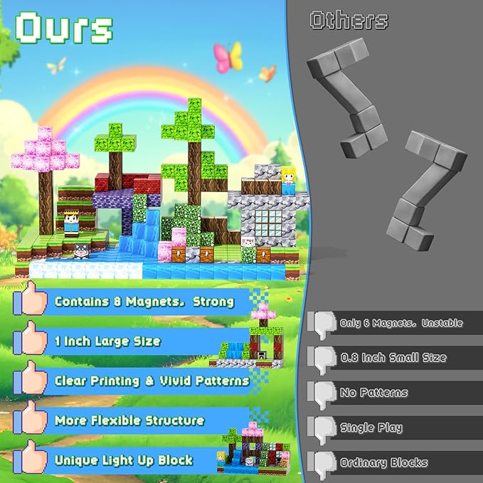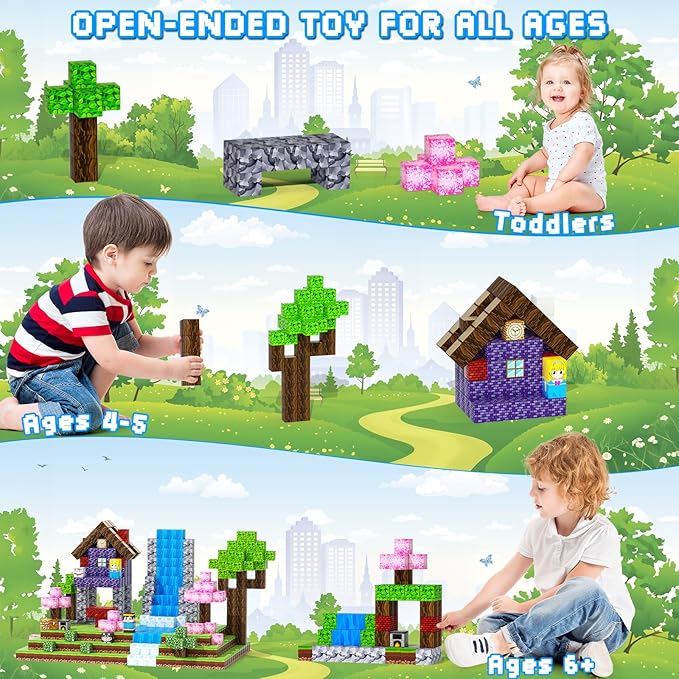 - Newest Rechargeable Light Cube Illuminates Children's Path to the Forest Magnetic World --- Our magnetic block toys come with a light cube that lights up your building block hut at the touch of a button. Besides, this cube has a built-in long-lasting battery and a free Type-C charging cable, designed for endless glow. This magnet toy is perfect for beginners and experienced little architects. They use these magnetic bricks to build, rotate, dismantle and rebuild, transforming screen time into exciting construction projects that foster imagination and overall learning.