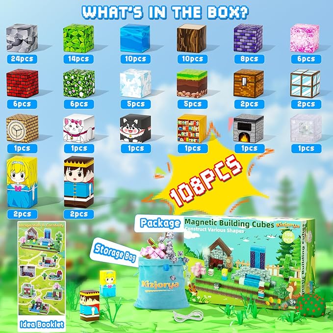 - Build a 3D Magnetic World with Magnetic Blocks for Kids to Enjoy a Magical Adventure --- KIZJORYA 108 PCS magnetic blocks feature 20 different patterns that encourage open-ended play. Kids build forest castles, use unique characters and light-up blocks, and embark on adventures with role-playing fun and pretend toys. Not only do they provide endless opportunities for creative construction and exploration, but they also promote critical thinking and problem-solving skills in a fun and interactive way. It comes with a creative booklet to guide and inspire children to explore the magnetic world.