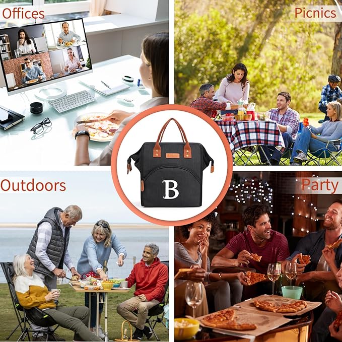Personalized Lunch Box for Women, Initial Reusable Insulated Lunch Bag, Wide-Open Adult Lunchbox Cooler Lunchbag, Leakproof Lunch Tote for Picnic Work Outdoors, Christmas Gift for Women, Black - B