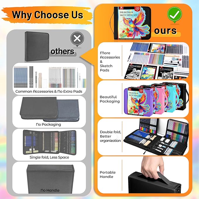 - Well Packed in Portable Travel Case: We understand that artists need the right art kit at their fingertips wherever they go. That's why our art set comes in a luxurious and portable case. Well organized and not taking up much space, it's perfect for artists on the move