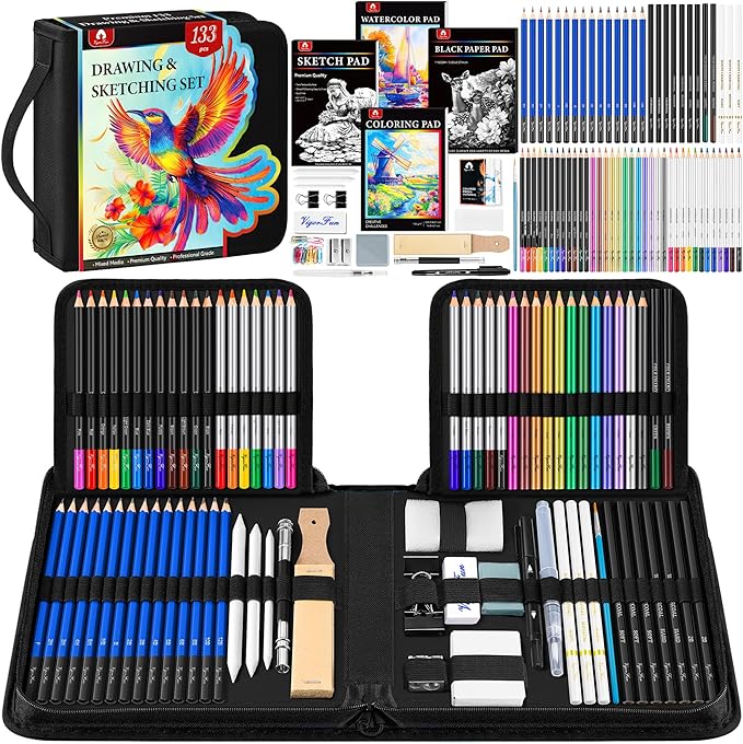 - 133 PCS Professional Drawing Kit Sketching Supplies: All you need are in this portable art case whether you are a professional or a beginner. It includes all the art supplies, specially added sketchbook, coloring book, watercolor pad and black paper pad. Perfect for drawing, sketching, shading, blending, layering and adult coloring books.With our professional drawing supplies kits, let your imagination flow and bring your ideas to your artistic journey