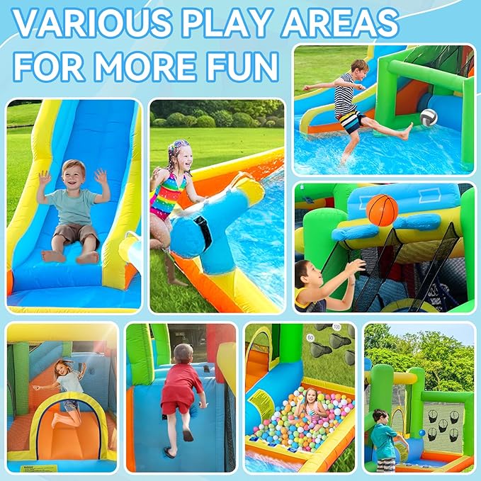 - 【9-in-1 Combo of Multiple Games】The 10-in-1 bouncy castle is including bounce house jumping area, water slide, climbing wall, ball shooting, basketball shooting, upgrade 2 water gun and big water pool with water sprayer,children can enjoy fun of various of games.In addition, the water gun and sprinkler can continuously provide cold water spray to keep the slide and splash pool wet, so that children can immerse in the cool inflatable water castle!