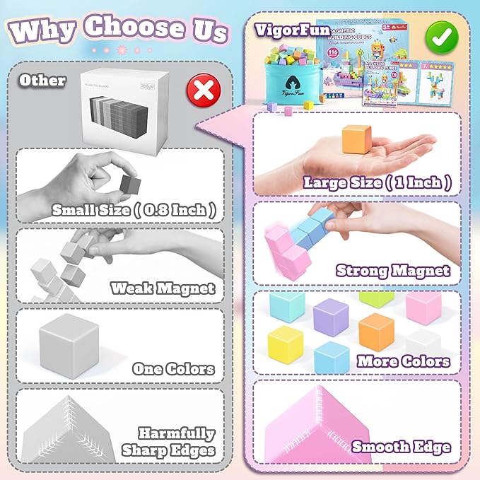 - 116 Pcs 1 inch Vibrant Magnetic Blocks Set: Spark endless creativity with our 116-piece set of 1 inch premium magnetic building blocks, featuring beautiful macaron colors for learning colors and shapes. This extensive set, ideal for kids ages 4-8, comes with a durable storage bag for easy cleanup and portability. Perfect for building everything from simple shapes to complex 3D models, it keeps kids engaged away from screens while fostering design skills and organizational habits