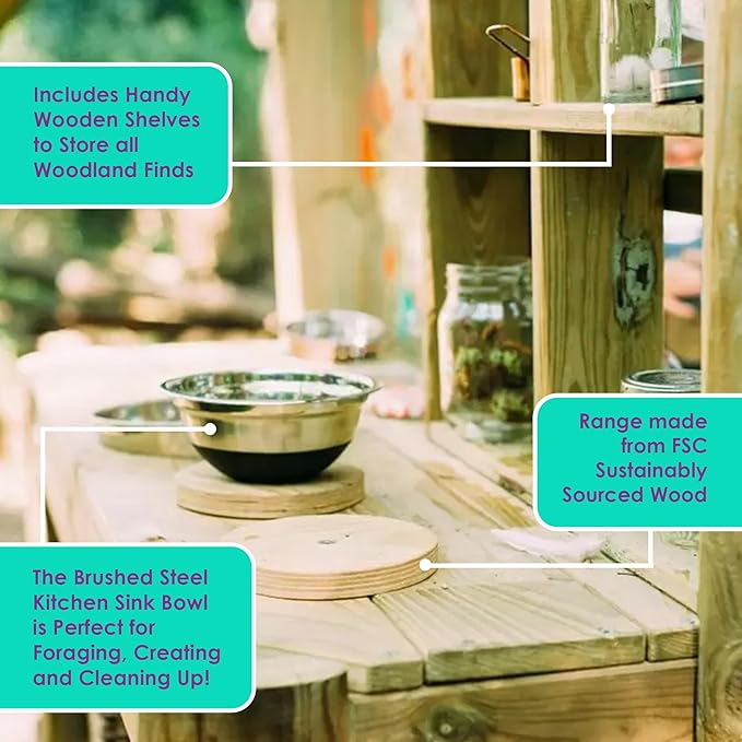 - š³ OUTDOOR ACTIVITY: Paint and create on the easy clean painting screen for water-based paints and keep the mess outside. The kitchen includes paintbrush holders and colorful paintbrush pens providing an educational and exciting experience for young minds. The Plum Mud Pie Kitchen includes handy shelves to store all woodland finds and Bamboo wind chimes for added sensory play.