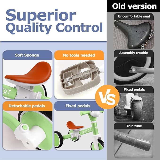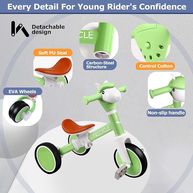 - QUALITY MATERIALS: Built with a sturdy carbon steel frameis and non-toxic paint, this kids tricycle guarantees durability. Its EVA foam wheels are designed for both indoor and outdoor use, providing silent, non-slip, and shockproof performance for an exceptional riding experience.