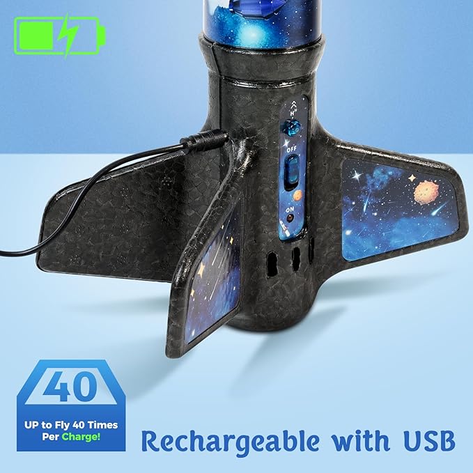 - ♻️Rechargeable Rocket: This electric rocket is powered by a rechargeable lithium battery, offering 25 to 40 launches on a single charge. With the included charging cable, a quick 30-minute charge is all it takes to keep the fun going, making outdoor games even more exciting.