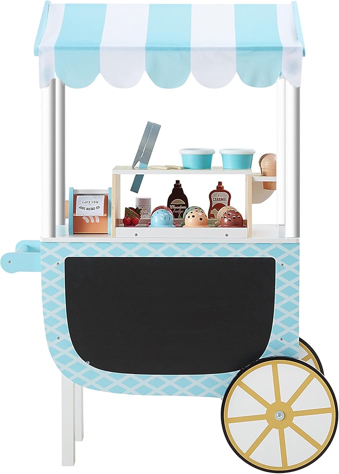 Teamson Kids My Little Helper Ice Cream Cart with Pretend Money, Colorful Magnetic Ice Cream Scoops and Chalkboard Panel, Blue/White