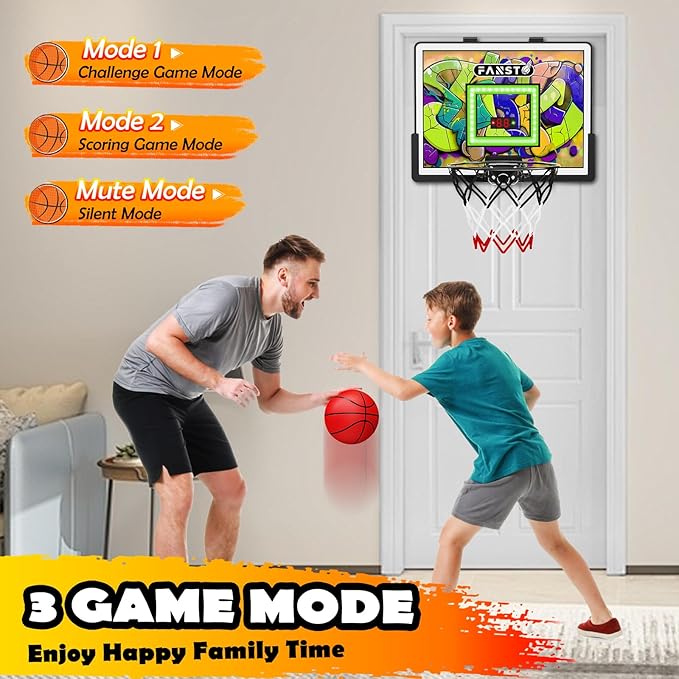 - 【Interactive Scoring & LED Lights】Mini basketball toy hoop features electronic scoring and cheers sound and cool led light, each goal will be celibrated, counted and cheered, that enhance kids' sense of achievement. Ther also offer both a countdown challenge mode and a regular scoring mode to add excitement to the game. The one-touch mute function allows kids to enjoy basketball fun without disturbing others, making it perfect for any setting!