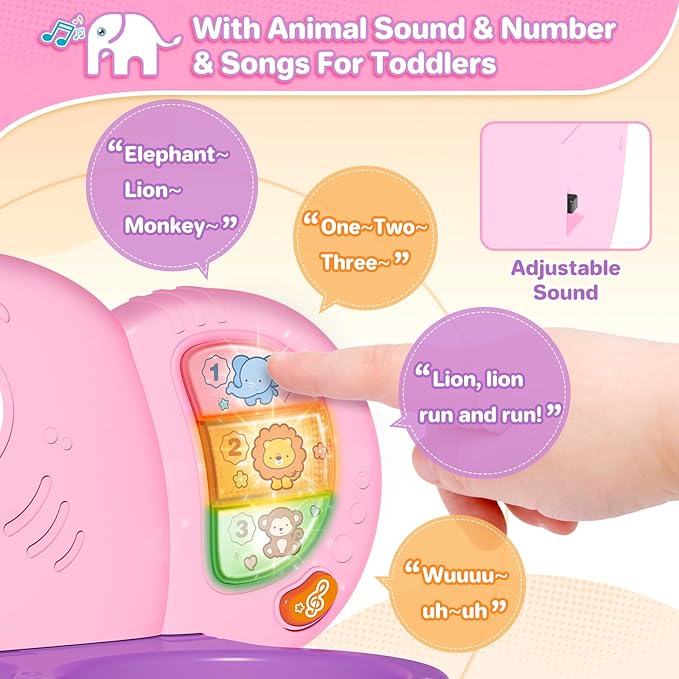 - 【Lights & 30+ Sounds & Songs】With lights, elephant's trunk & music button give off seven colors of light.The volume of this playset is adjustable, the soft music and lights can also accompany toddlers to sleep.Toddlers toy can make a variety of sounds, there are realistic animal calls, number, 30+ lovely music, soothing sleep songs,children can hear the music cheers when he score a goal.