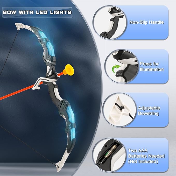 - 【Safe for Kids & Easy to Use】Equipped with super suction arrow, it can be firmly attached to the target, dartboard, glass smooth surface. Such a brilliant design making it an ultra safe toy for kids aged 3 and above. Besides, the bow is lightweight and easy to handle, ensuring a comfortable grip for small hands. The built-in LED lights of the bow making it a cool toy as well as perfect toy for children to enjoy in rooms with low light or in dark environments (note: batteries are not included)