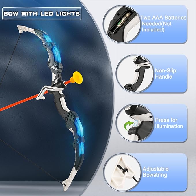- 【Safe for Kids & Easy to Use】Equipped with soft suction cup tips, the arrows can be firmly attached to the target or glass smooth surface. Such a brilliant design making it an ultra safe toy for kids aged 3 and above. Besides, the bow is lightweight and easy to handle, ensuring a comfortable grip for small hands. The built-in LED lights of the bow making it a cool toy as well as perfect toy for children to enjoy in rooms with low light or in dark environments (note: batteries are not included)