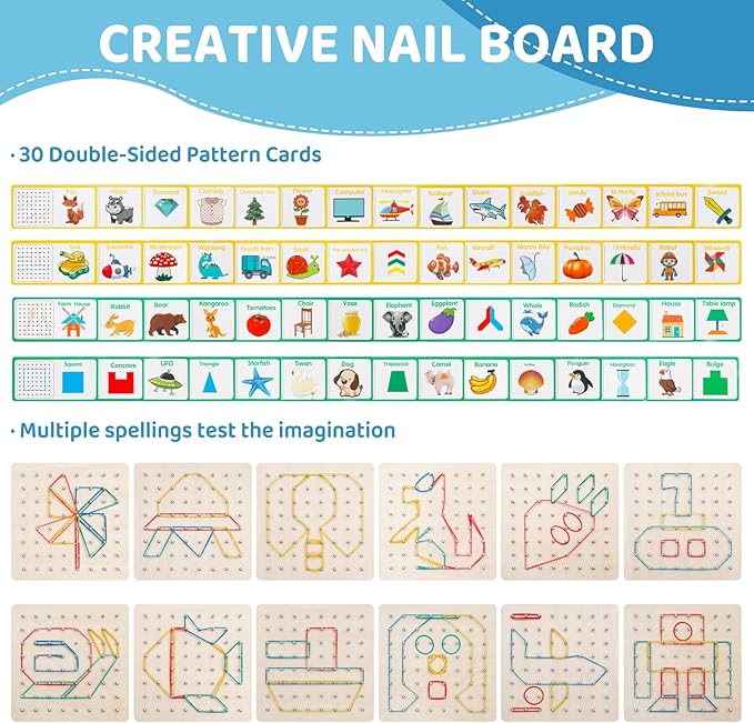 - Educational & Fun Learning Tool:Combining elements of math, art, and geometry, this wooden geoboard is an excellent tool for early education. Children will develop a solid understanding of shapes, symmetry, and counting while also exploring their artistic side by creating colorful, unique designs.