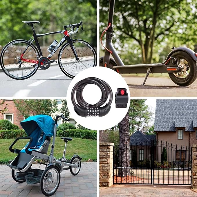 - MULTI-PURPOSE: The cable is 5.6 feet, long enough to lock 2-3 bikes together, or lock your bike to a tree, gate, fence, railing, thick pole and others. The lock can also be used for motorcycles, scooters, skateboards, grills, ladders, doors, lawnmowers and many others.