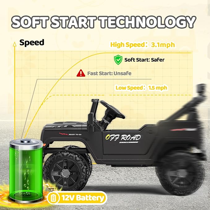 - All For Kids' Safety: When the kids electric vehicle starts up, the soft start system will operate to avert bumps caused by sudden acceleration or braking. It is equipped with a 13" wide seat featuring an adjustable safety belt and lockable doors, providing enhanced protection for your child. An override brake function on the remote adds an additional layer of safety. A max of 3.1 mph safe speed for smooth rides on outdoor adventures