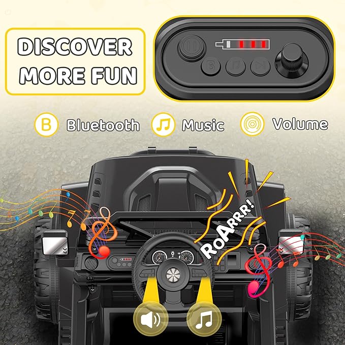 - Fun & Easy to Operate: This kids ride on truck car is equipped with MP3 player that supports wireless connection to your phone. Except for the pre-programmed songs, you can also play your little ones’ favorite music while cruising. Unlike those traditional music panels, this one has big buttons that are super user-friendly for little hands to operate, rotary knob for volume adjustment, and easy-to-read battery level bar from the screen