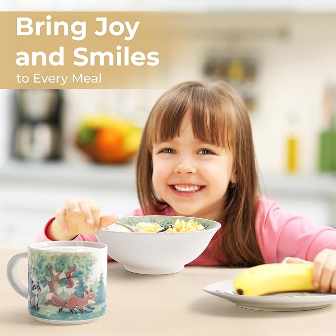 MIAMIO β Set of 3 Kids Dinnerware Set/Porcelain Children Dishes, Kids Dish Set, Childrenβs Tableware Set - Includes Plate, Bowl and Cup β For Kids and Toddler (Forest)