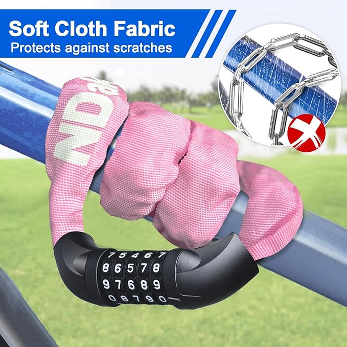 - SCRATCH-PROOF FABRIC PROTECTION: The bicycle chain lock is wrapped by a high quality polypropylene fabric, which is scratch-proof and wear-resistant, anti-hot and anti-icing hands; it protects the chain and prevents it scratching your bicycle frame, long lifespan.