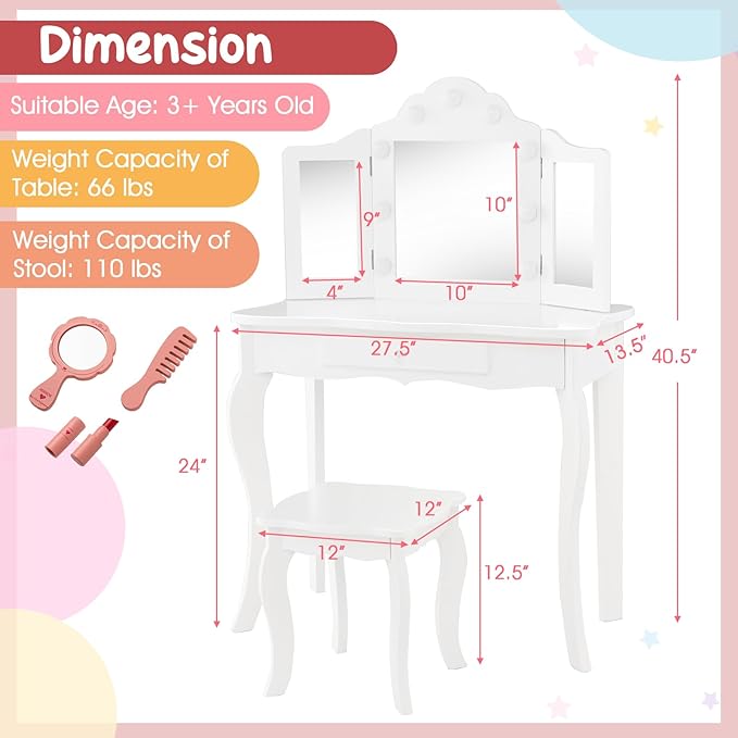 - ADJUSTABLE TRICOLOR LIGHTS: Designed with 9 LED lights, this kids vanity table has 3 lighting modes, including warm yellow, warm white and cold white. Just short press to change the color and long press to adjust the brightness.
