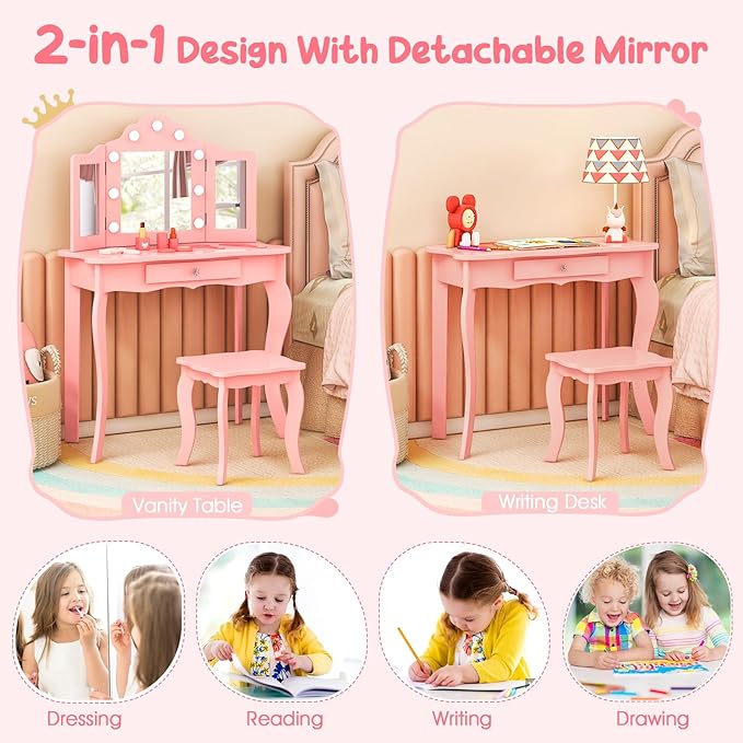 - MULTI-FUNCTION IN ONE: The mirror on top of this kids vanity with mirror and lights is removable. With 2 in 1 design, the girls vanity can be used as a learning desk for writing, drawing and reading.