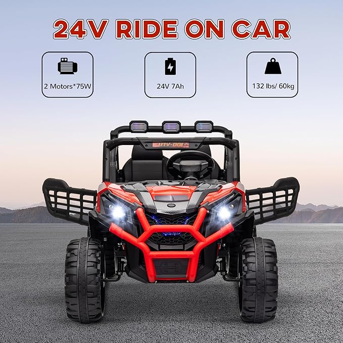 - Two Seats, Double the Fun: This 24V 7AH ride-on packs dual motors for powerful performance and two spacious seats with safety belts, suitable for shared adventures. Enjoy up to 45 minutes of secure, thrilling rides on a single charge!