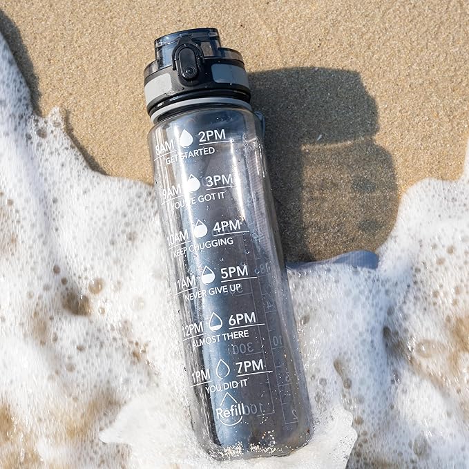 OLDLEY Water Bottle, 32oz Motivational Sports Water Bottle with Time Marker - Times to Drink - Tritan, BPA Free, Wide Mouth Leakproof,Smoke Grey (1 Bottle)