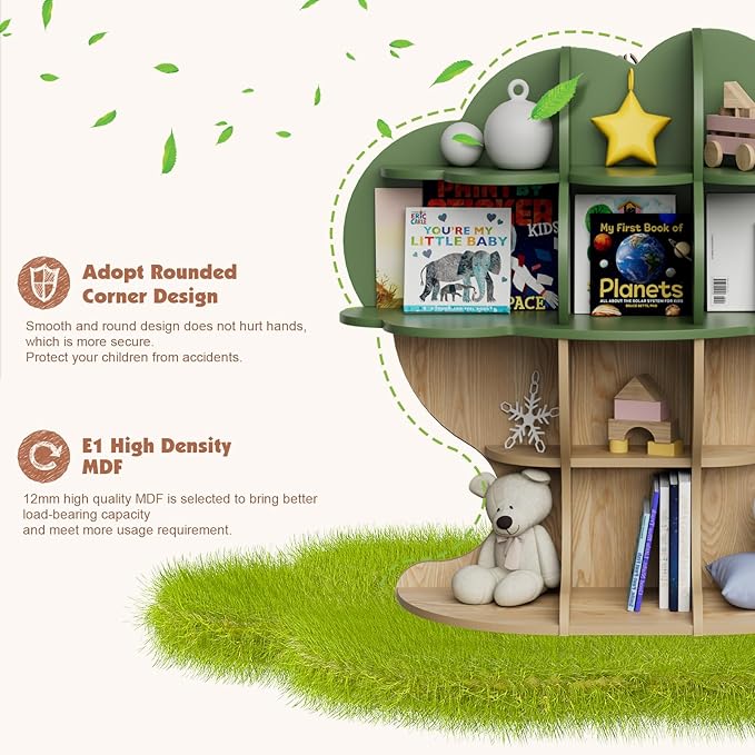 - Natural Wood Tree Kid Bookshelf with Durable and Safe Material: This kids’ bookcase is constructed with superior 15mm E1 MDF material which is very sturdy to last long time. This edges of kids’ bookshelf and toy storage are smooth and round to prevent any accidental bumps or scratches. We ensure our kids’ bookshelf and toy storage organizer durability and safety for your little ones. In addition, the thick boards and solid construction allow each shelf to support heavy-duty items.
