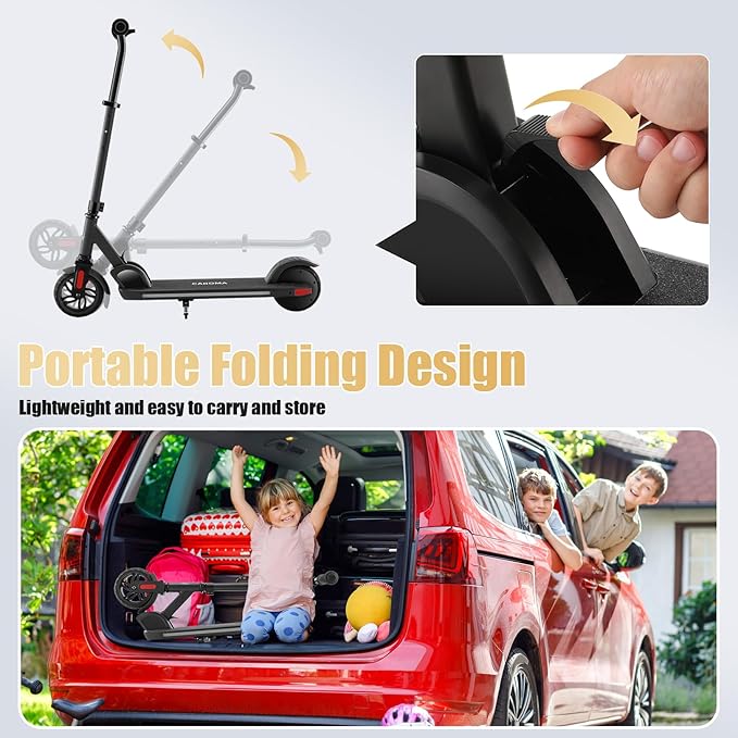 - Powerful 180W Rear Motor: Equipped with an upgraded 180W rear motor, this caroma electric scooter for kids offers a smooth and powerful ride. Kids can easily tackle small inclines and enjoy a stable performance on various terrains