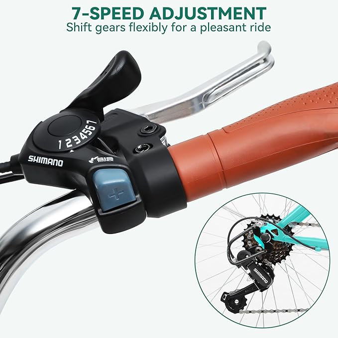 - 7-Speed Shifts: Enjoy a smooth ride on any terrain with our 24 26-inch beach cruiser bike featuring a 7-speed shifter; It allows for effortless resistance and speed adjustment to match various road conditions, making your ride more enjoyable and less strenuous
