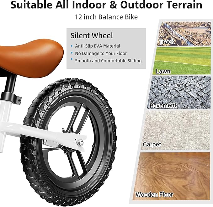 - 12 INCH ALL TERRAIN SILENT WHEEL TIRES - The toddler balance bike toys,it equipped with 12 inch extra-thick silent-wheel tires, make your children safe and stable while ridding. These tires is make of premium anti-slip EVA material, no damage to your floor when rid indoor. It suitable for different terrains, such as grass, sand, wetlands, carpets and so on.
