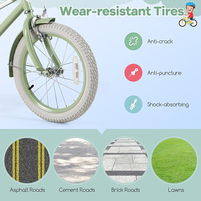 - [ Smooth & Safe Riding Experience ]: The anti-crack and wear-resistant tires ensure a smooth and steady ride on asphalt roads, cement roads, brick roads, and lawns. 2 detachable training wheels help beginners keep balance and pedal independently. The front and rear reflectors included in 16" & 18" bikes take an important role to keep kids visible when they ride at night.