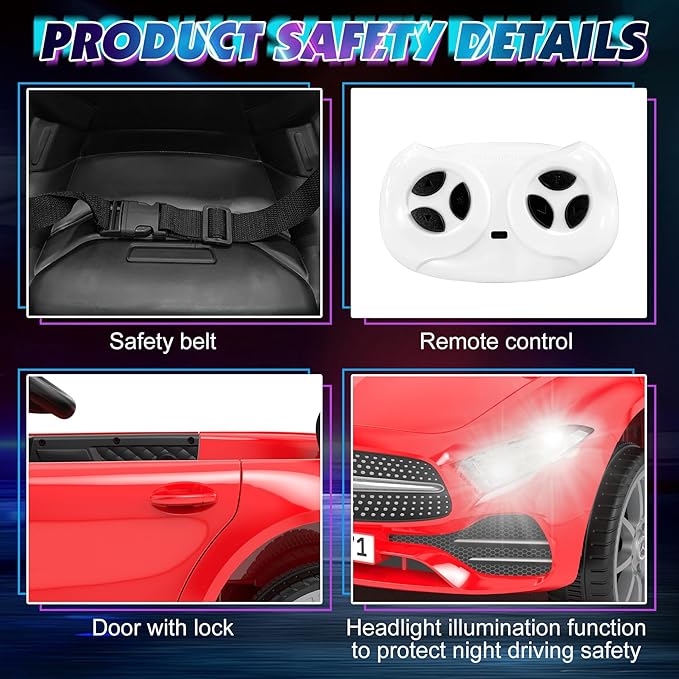 - More Safety: We deliberately add handrails beside the seat and an adjustable safety belt with a buckle to prevent your child from falling off,15-inch weels make driving more stable, can run smoothly on a variety of pavements, such as grassland, sandy beach, road etc, ideal for outdoor playing. Parental remote control & seat belt offer maximum safety for your kids.
