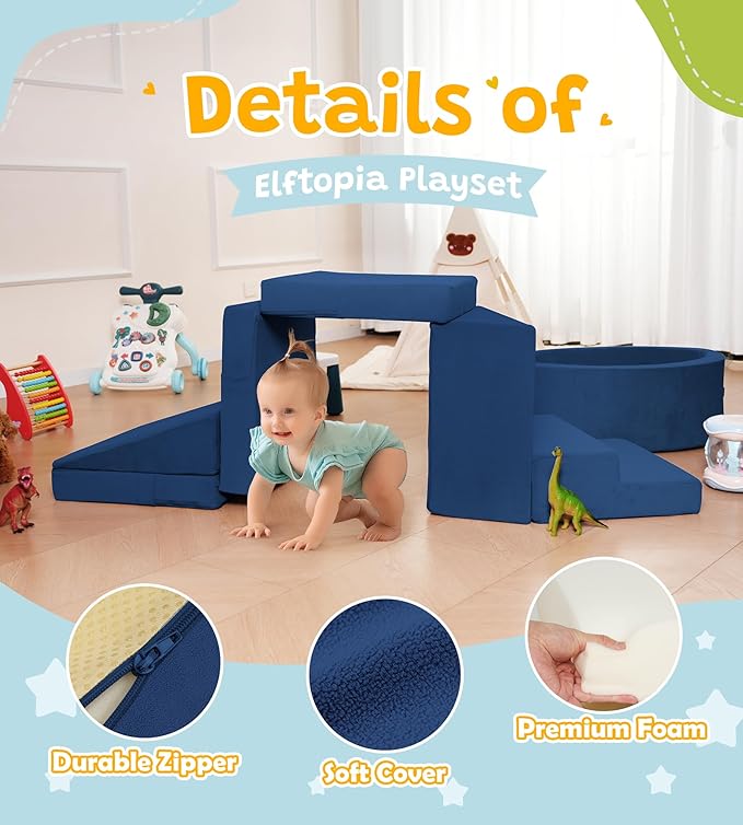 - Multi-functional Design: The foam climbing set includes a ball pit, two triangular inclined planes, staircase, and foldable square cube, allowing for various combinations for kids or toddlers to safely climb with different levels of difficulty