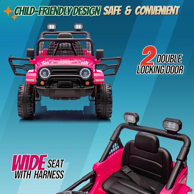 - Child Friendly Measures for Safety: 5-point seat harness with locking doors can prevent kid from falling off. Adjustable speed 3-5 mph, Four wheels with spring suspension system and durable tires for a smooth ride.