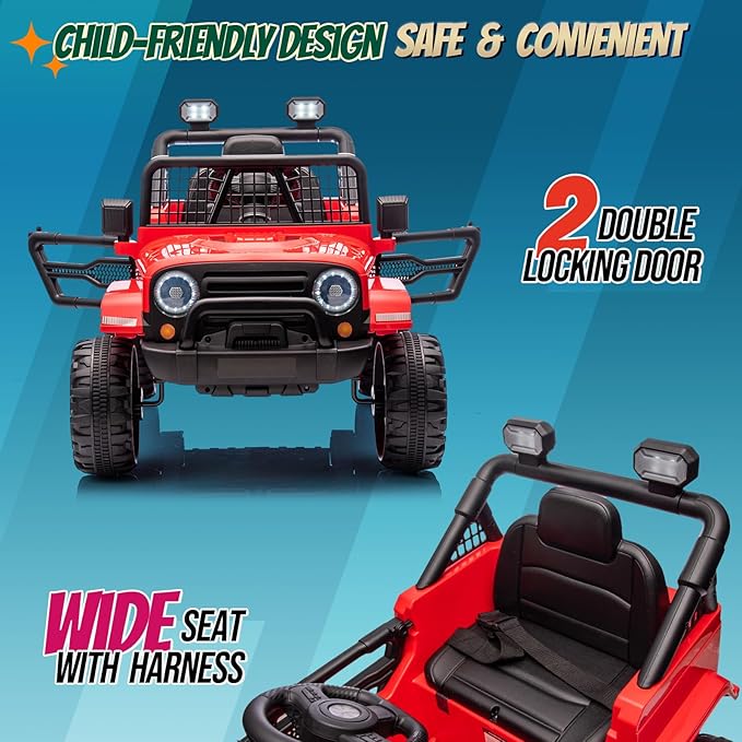 - Child Friendly Measures for Safety: 5-point seat harness with locking doors can prevent kid from falling off. Adjustable speed 3-5 mph, Four wheels with spring suspension system and durable tires for a smooth ride.
