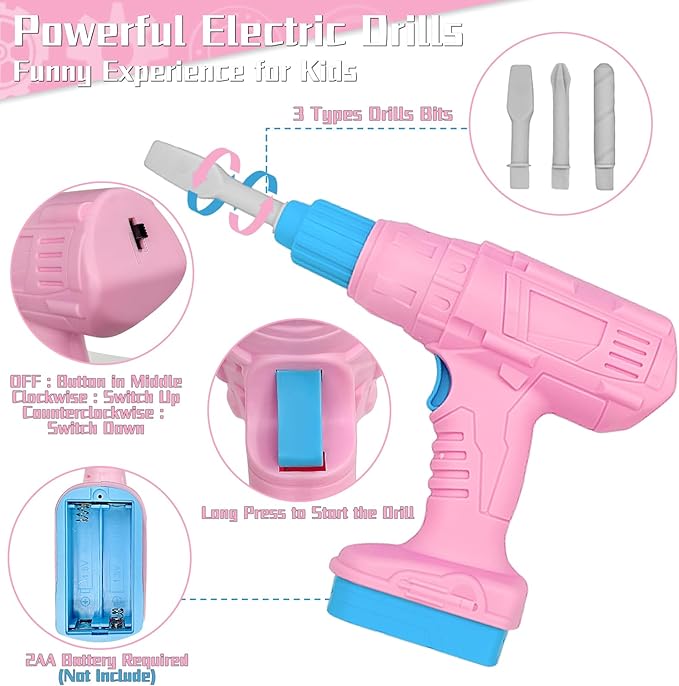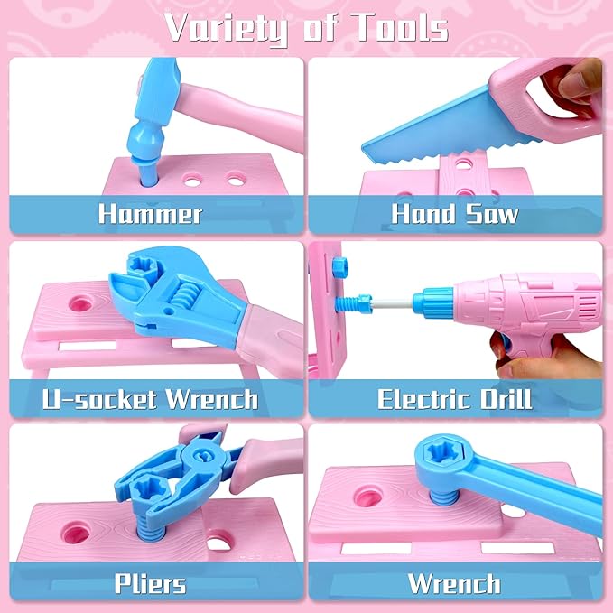 - Realistic Kids Tool Set for Hands-On Play. This 55-piece kids toddler tool kit includes a pink vest, tool belt, spinning battery-powered drill, hammer, screwdriver, wrench, and pliers, and screws that you can actually screw, offering a truly realistic play experience.