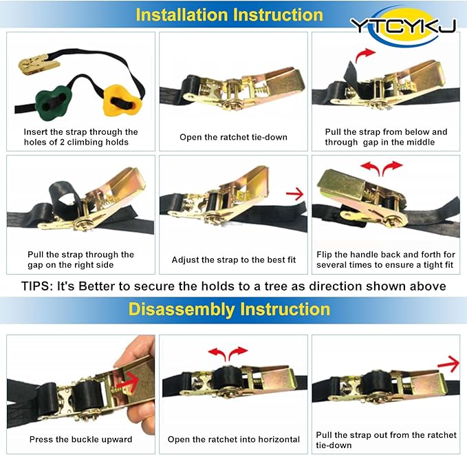 - 【Easy to Remove and Install】No extra tool required,The tree climbing holds can be easily added to any robust tree through ratchet strap. Each Ratchet Strap place 2-3 climbing holds on, adjust it to fit the width of the tree