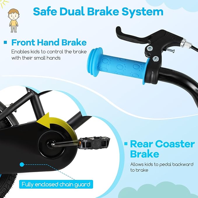 - [ Comes with A Dual Brake System ]: The front hand brake enables kids to control the brake with their small hands. The rear coaster brake allows kids to pedal backward to brake conveniently. Moreover, there is a fully enclosed chain guard to prevent kid's feet from getting pinched, ensuring higher safety.