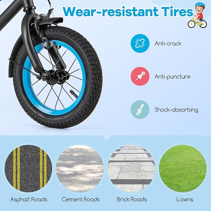 - [ Smooth & Safe Riding Experience ]: The anti-crack and wear-resistant tires ensure a smooth and steady ride on asphalt roads, cement roads, brick roads, and lawns. 2 detachable training wheels help beginners keep balance and pedal independently. The front and rear reflectors included in 16" & 18" bikes take an important role to keep kids visible when they ride at night.