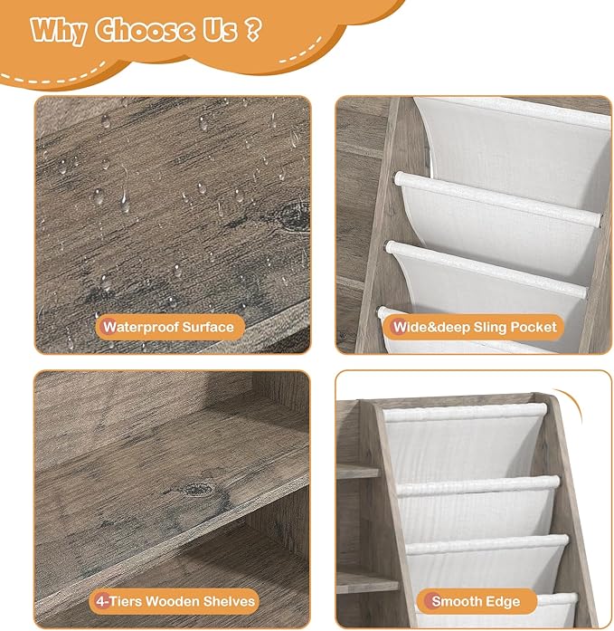 - Five Deep Cotton Linen Storage Sling Pockets: This space-saving kids book rack with storage sling pockets display books with covers facing forward for easy identification by little one. This bookcase can store reading books, coloring books, comic books, picture books... This 4tier wood toddler bookcase can store children’s favorite books, notebooks, and toys...It has enough storage space for building blocks, small trucks, plush animals, model cars, dolls, memorabilia, art supplies etc...
