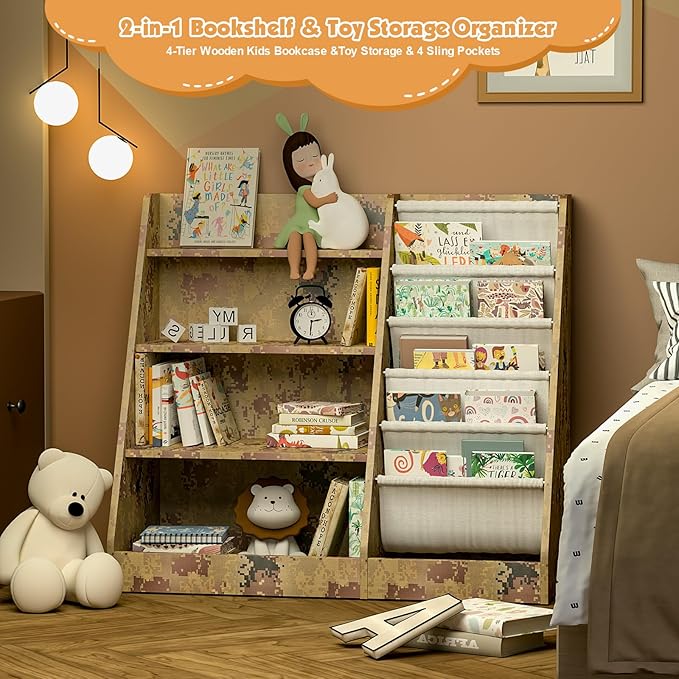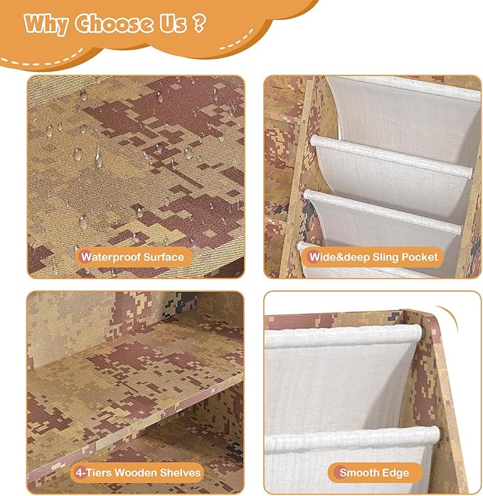 - Five Deep Cotton Linen Storage Sling Pockets: This space-saving kids book rack with storage sling pockets display books with covers facing forward for easy identification by little one. This bookcase can store reading books, coloring books, comic books, picture books... This 4tier wood toddler bookcase can store children’s favorite books, notebooks, and toys...It has enough storage space for building blocks, small trucks, plush animals, model cars, dolls, memorabilia, art supplies etc...